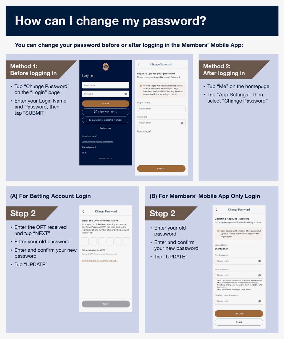 You can change your password before or after logging in the Members’ Mobile App: