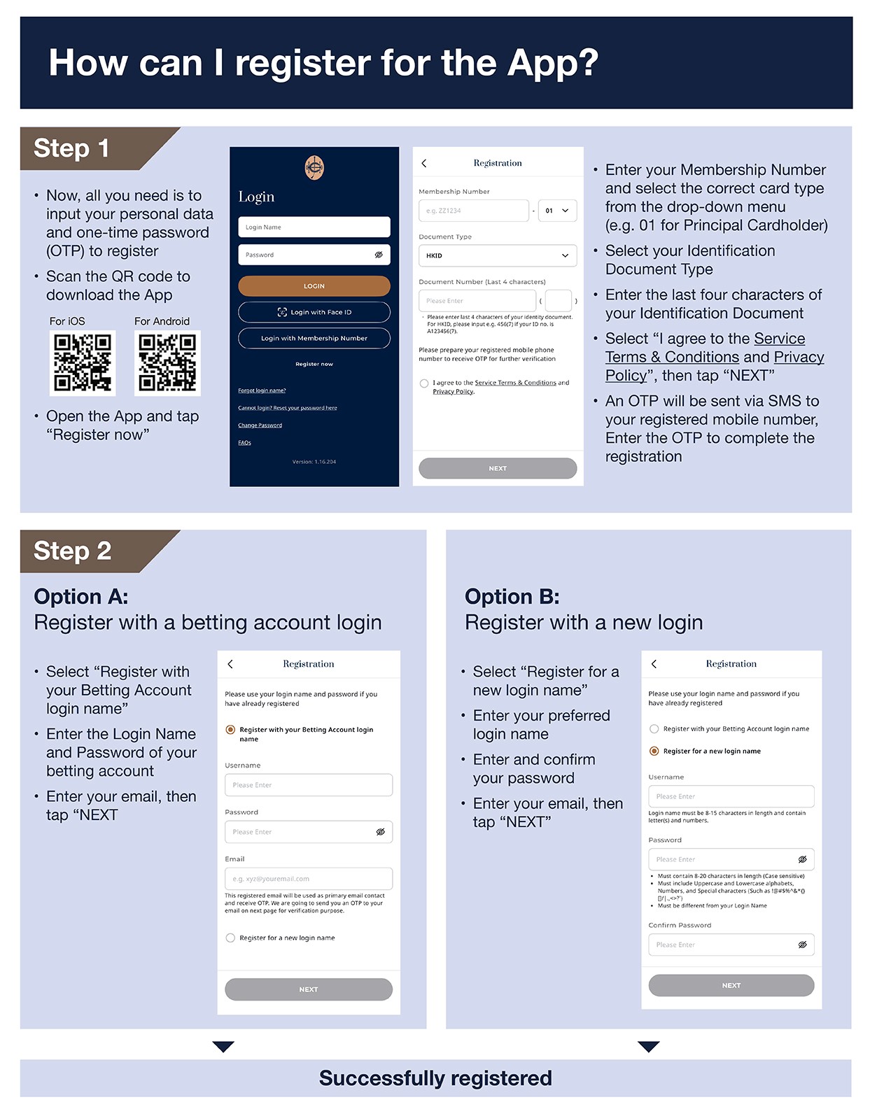 - Please use the same identification document information as in our Membership record or update the related information in our Membership record and complete the App registration accordingly.